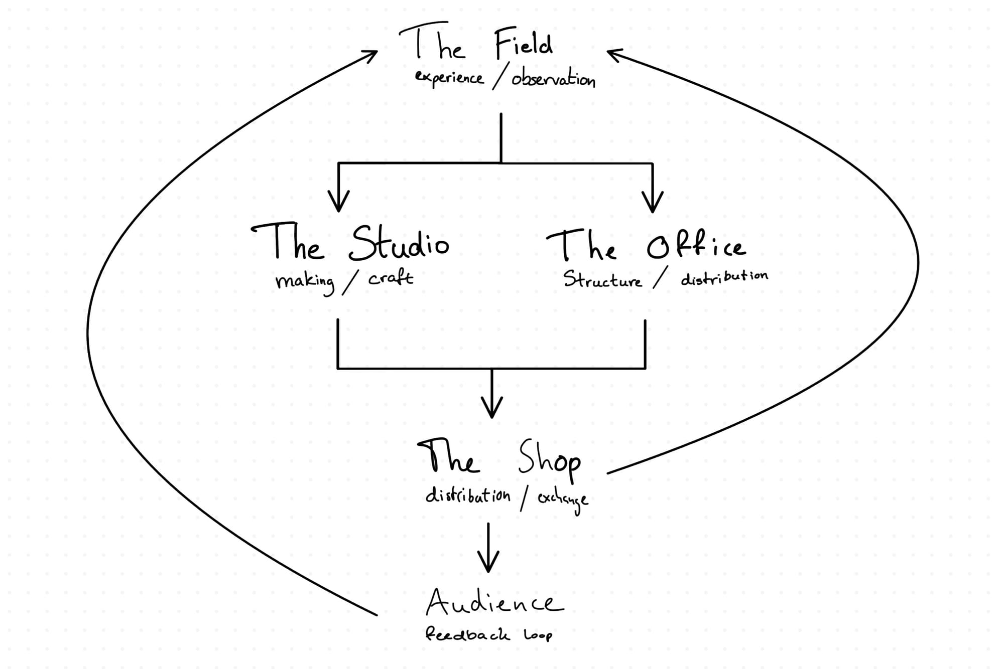 Your time in the Field is for gathering whatever you come across and sparks your curiosity. Time in the Studio is for finding understanding of the things you found. The Office ensures you can share that understanding. The Shop is how we monetize this work so that we can reinvest into the field work, closing the loop. As a bonus, the audience always provides some version of feedback (even zero response is a version of feedback) and you bring that with you next time you go into the Field.